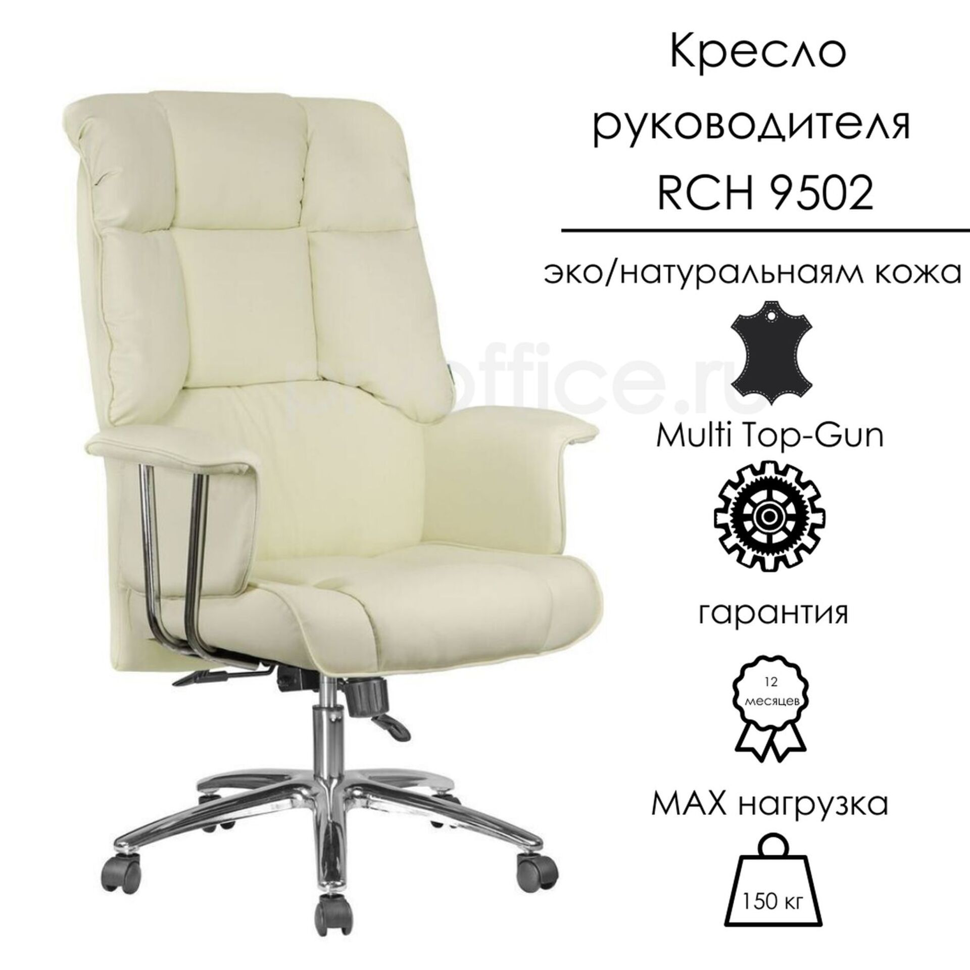 Кресло руководителя RCH 9502 - офисное кресло из высококачественных материалов, которое подойдет под любой интерьер. Хромированные опоры c механизмом Multi Top-Gun позволяют регулировать жесткость качания и зафиксировать кресло в удобном для Вас положении. Немаловажный факт – максимальная нагрузка до 150 кг. На ваш выбор два варианта исполнения – натуральная кожа и экокожа – в двух цветах (черный и кремовый).