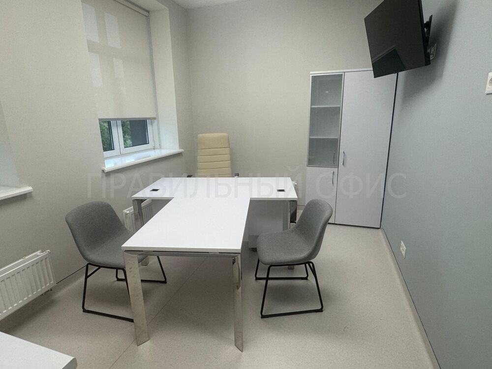 1. Стол руководителя П-образной конфигурации M-O.MP-SRR-4.8 стал центральным элементом кабинета. Его просторная столешница предоставляет достаточно места для ведения документации, работы за компьютером и приема пациентов. Прочная и элегантная конструкция на стальном каркасе сразу задает тон всему интерьеру.