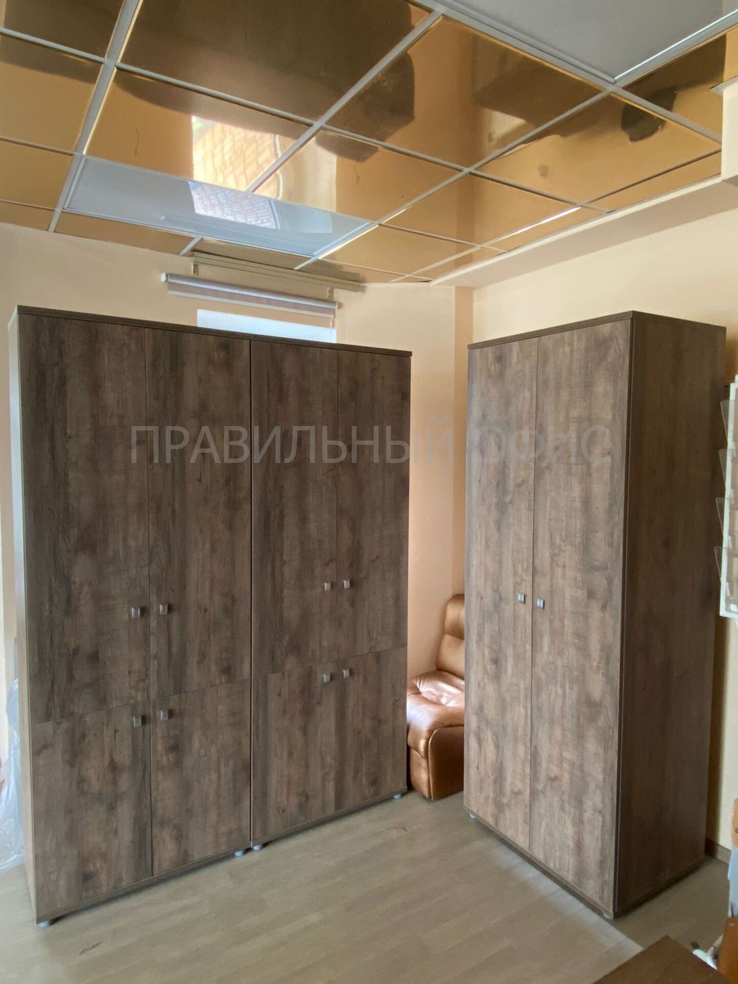 Композиция из закрытых шкафов V-602 и низких шкафов V-652 со стеклянными фасадами и гардеробом для сотрудников V-731, обеспечила оптимальное решение в плане хранения.